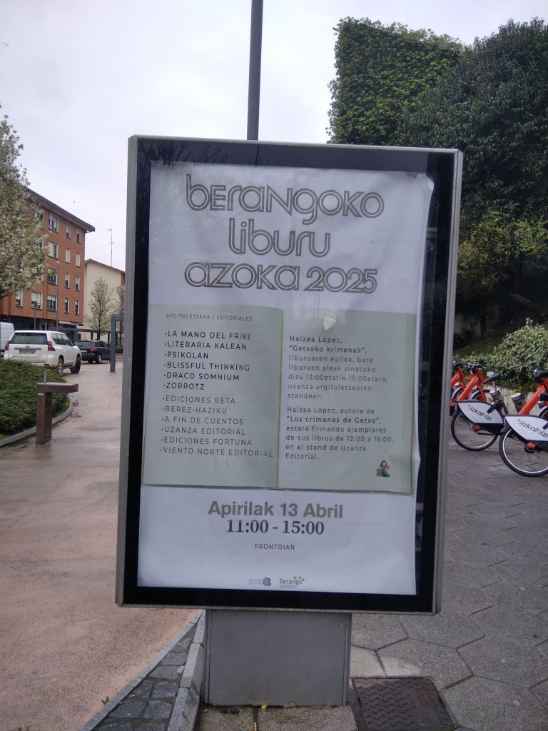 El pasado domingo 13 de abril se celebró una nueva edición de la feria del libro de Berango y pese a que a las primeras horas de la mañana el día jarreaba impetuosamente, tiempo después escampó y el frontón del municipio se colmó de lectores, lectoras y curiosos que deambularon entre los libros expuestos por algo más de una docena de editoriales venidas de muchas partes de la geografía vasca.